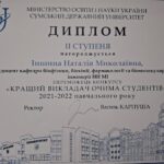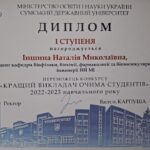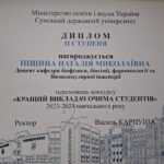 Викладацька майстерність доцента кафедри біофізики, біохімії, фармакології та біомолекулярної інженерії Іншиної Наталії Миколаївни завжди високо цінується студентами, які вивчають біологічну та біоорганічну хімію. Так, за результатами підведення підсумків конкурсу “Кращий викладач очима студентів” у 2023-2024 н.р. Іншина Н.М. була нагороджена дипломом І ступеня. До речі, Наталія Миколаївна є призером даного конкурсу вже третій рік поспіль.