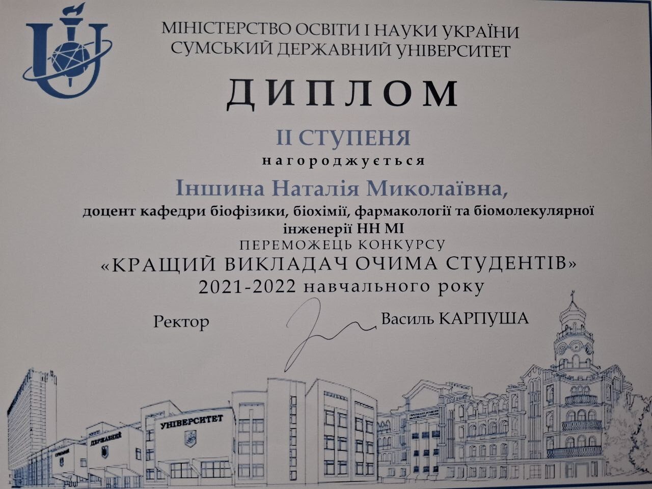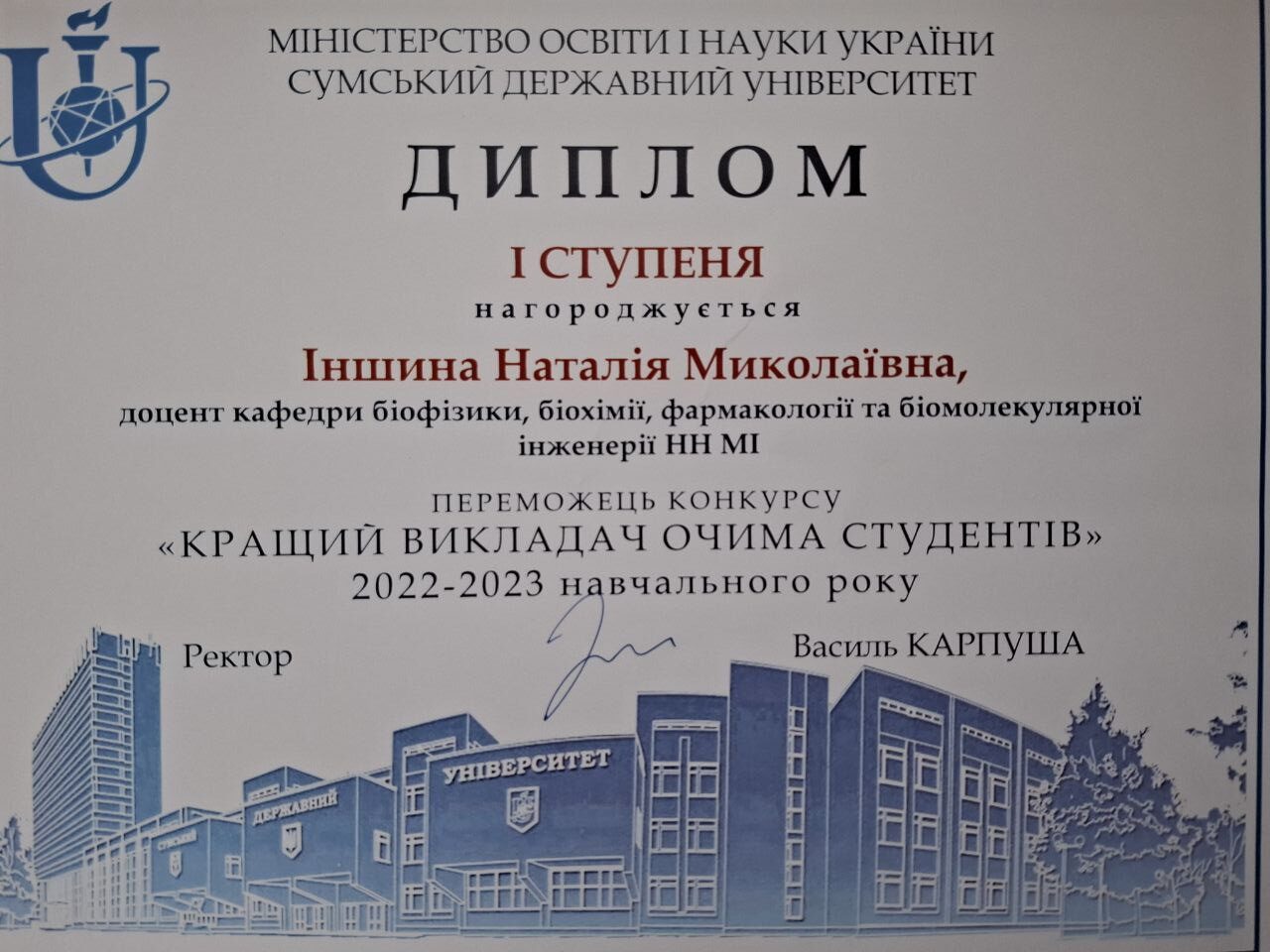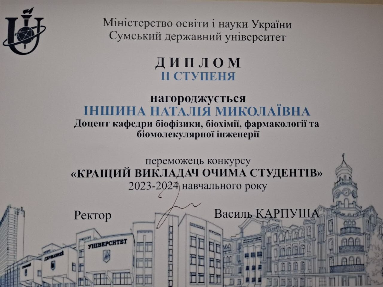 Викладацька майстерність доцента кафедри біофізики, біохімії, фармакології та біомолекулярної інженерії Іншиної Наталії Миколаївни завжди високо цінується студентами, які вивчають біологічну та біоорганічну хімію. Так, за результатами підведення підсумків конкурсу “Кращий викладач очима студентів” у 2023-2024 н.р. Іншина Н.М. була нагороджена дипломом І ступеня. До речі, Наталія Миколаївна є призером даного конкурсу вже третій рік поспіль.